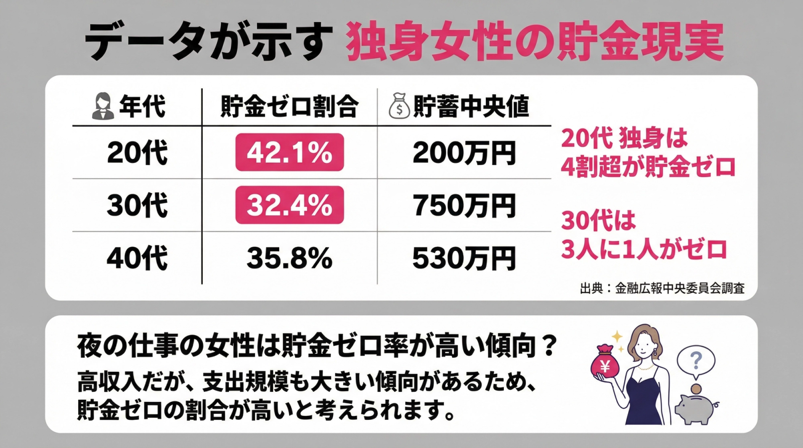 - 30代独身女性の約33%が貯金ゼロ(金融広報中央委員会調べ)。夜職は収入が高い分、支出も青天井になりやすい