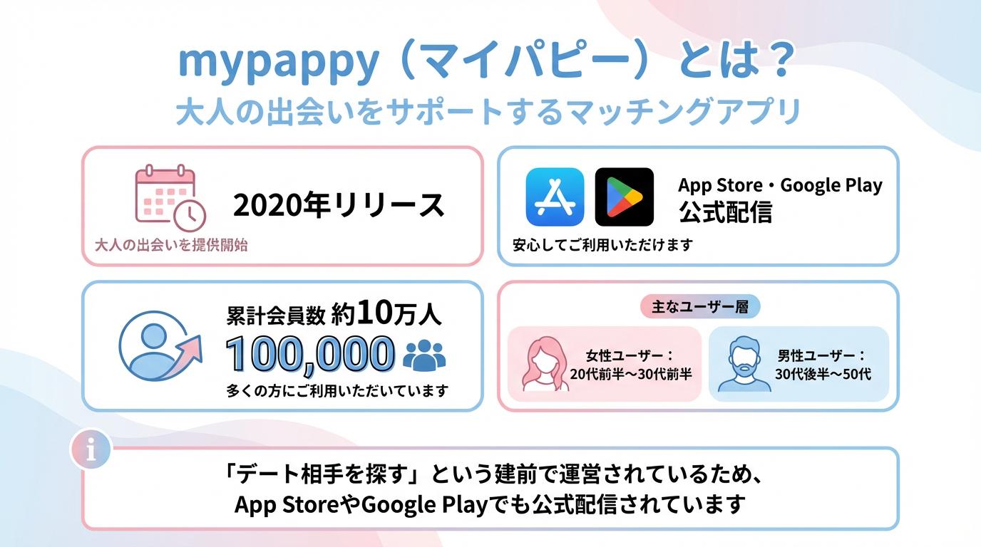 mypappy(マイパピー)は、2025年にリリースされた大人の出会いをサポートするマッチングアプリです。「デート相手を探す」という建前で運営されているため、App StoreやGoogle Playでも公式配信されています。