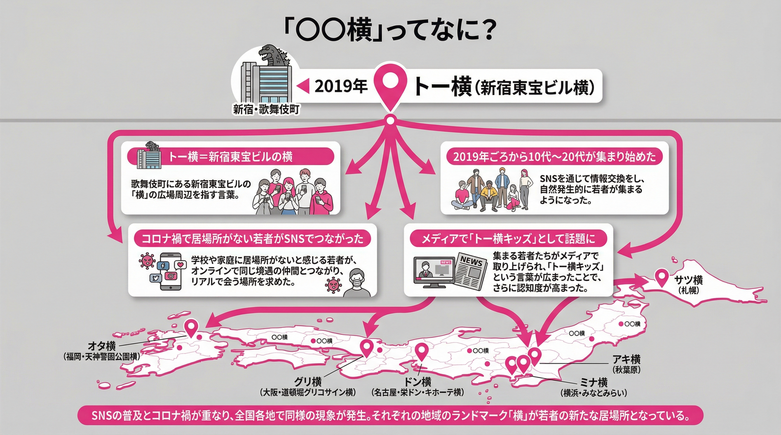 「〇〇横」。SNSで見かけたことがある人も多いと思います。繁華街の特定スポットに若い子が集まって、仲間と過ごしている場所のこと。その始まりは東京・歌舞伎町の「トー横」です。