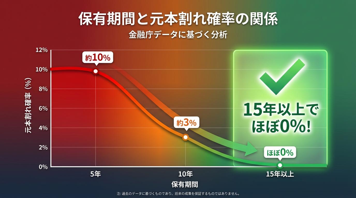 金融庁の過去データ分析によると、保有期間による元本割れ確率は以下の通りです。