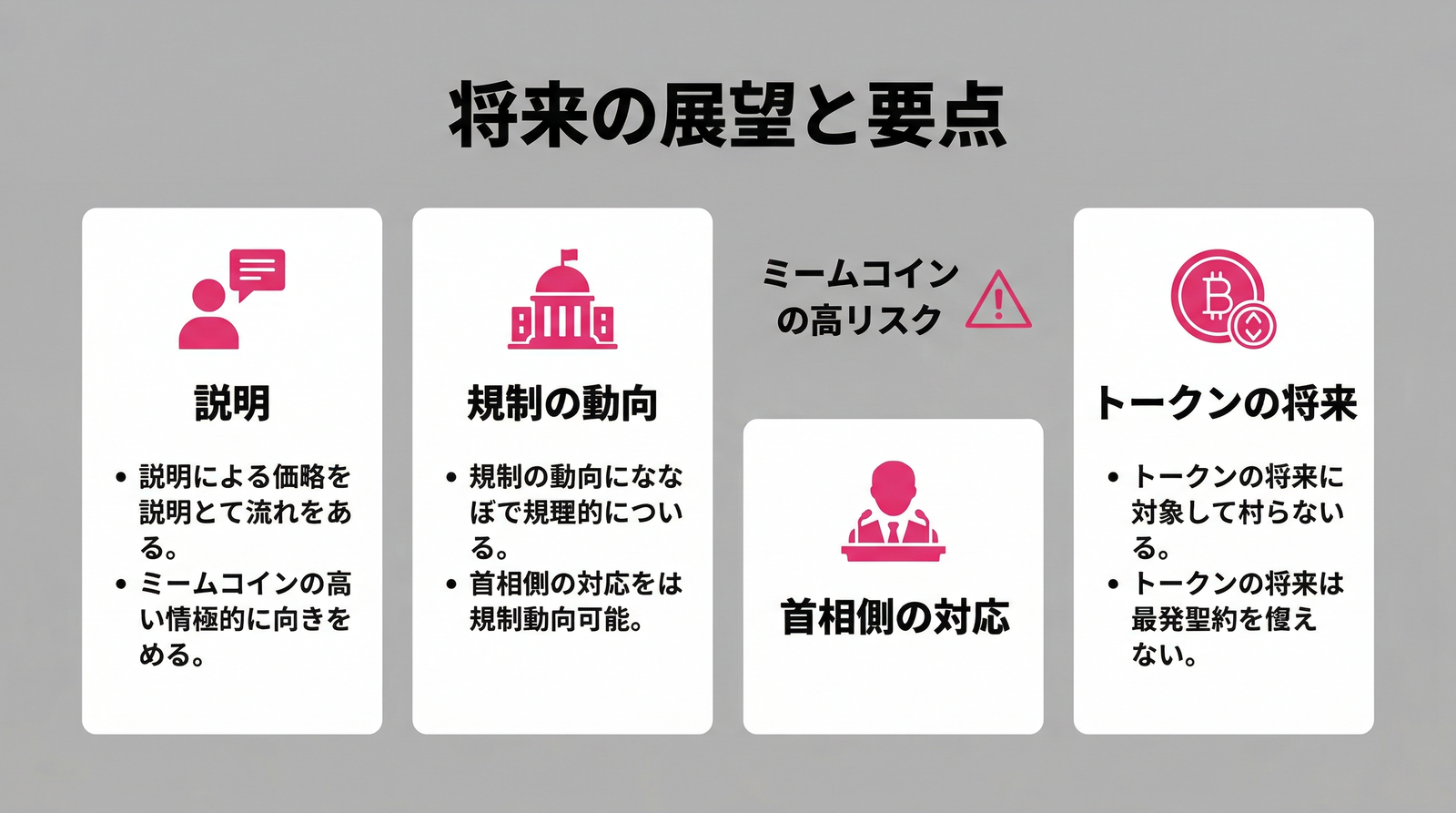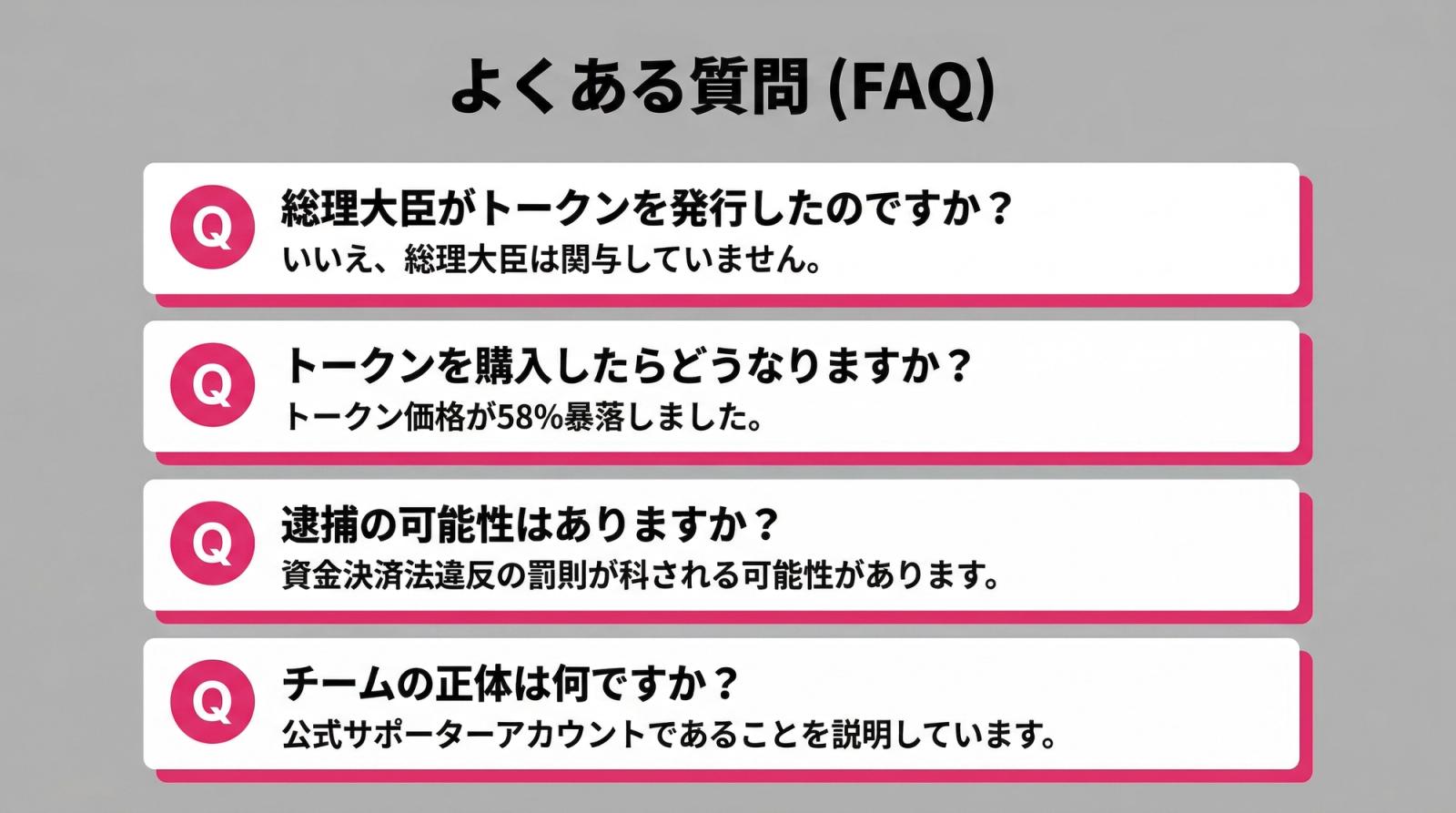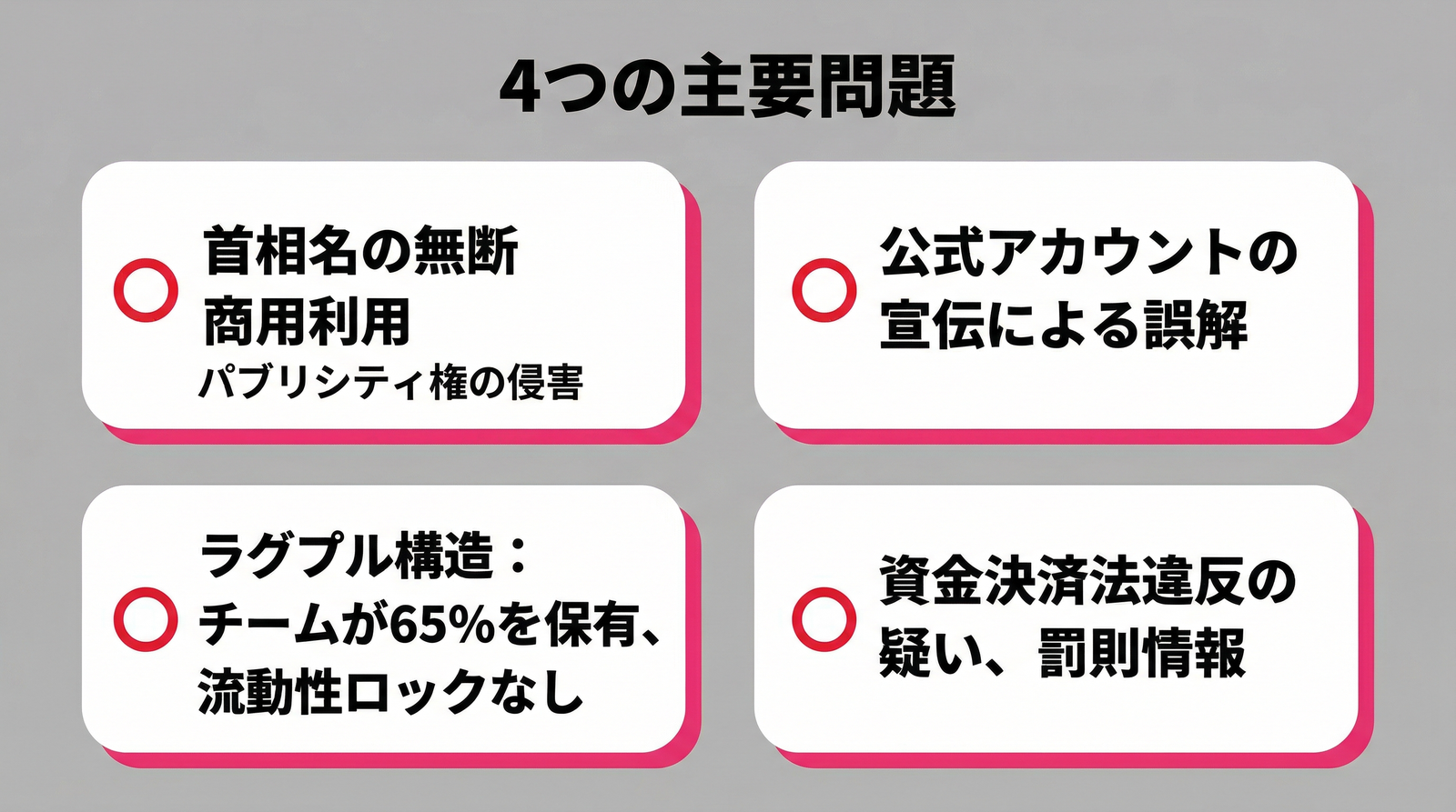 ミームコインはそもそもハイリスクな投資対象です。ただ今回の件は、「現職首相の名前を無許可で使った」「公認後援会が宣伝した」という点で、単なるミームコインの炎上とは次元が違います。